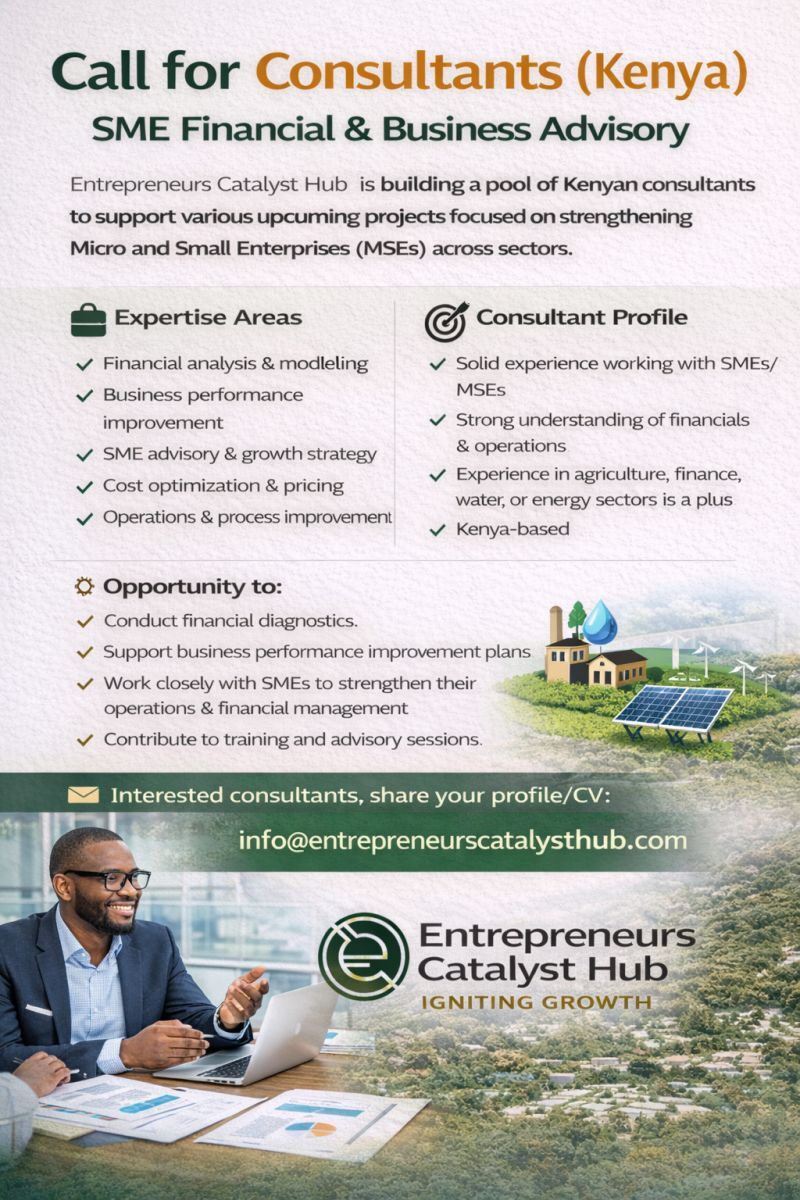 Entrepreneurs Catalyst Hub (ECH) is seeking experienced consultants and advisors to support SME growth and performance improvement initiatives across Kenya.
